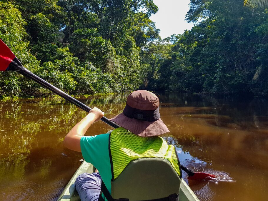 Une fois installé à Juma Lodge, rendez-vous à la tour d’observation toute proche. À 31 m de haut, vous aurez une excellente vue d’ensemble de la région. Votre guide vous expliquera la construction de l’hôtel et les pratiques de développement durable, tout en observant la faune et la flore qui vous entourent. Vous pourrez planter des semis indigènes, ce qui permettra aux plus jeunes de mieux apprécier la forêt qui les entoure. Passez le reste de l’après-midi à parcourir en canoë les minuscules igarapés et igapós (sections inondées de la forêt). En pagayant tranquillement à travers le réseau aquatique, vous et les enfants vous sentirez véritablement immergés dans la forêt qui vous entoure.