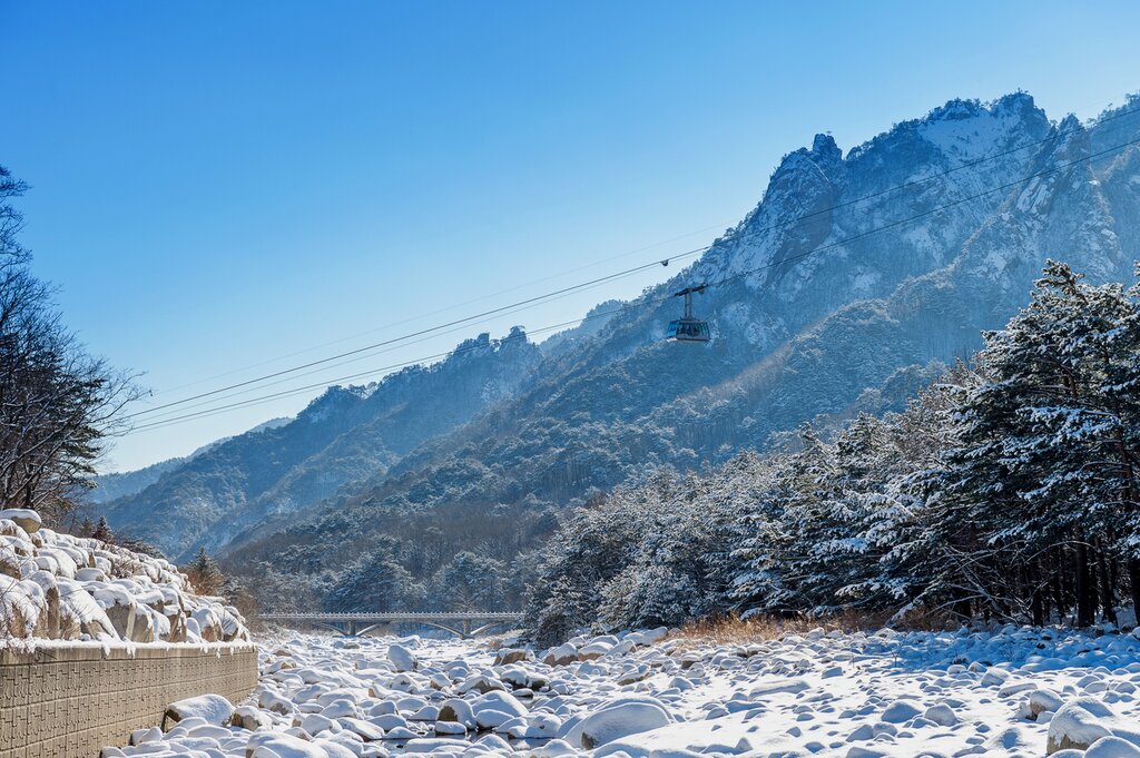 Après le petit-déjeuner à votre hôtel, explorez la beauté du parc national de Seoraksan, un district de préservation de la biosphère de l’UNESCO, avec un guide privé aujourd’hui. Commencez par monter en téléphérique jusqu’au pic de la forteresse de Gwongeumseong pour admirer les divers paysages enneigés du parc. À votre arrivée, admirez le magnifique panorama du mont Seoraksan, l’une des plus hautes montagnes de Corée.