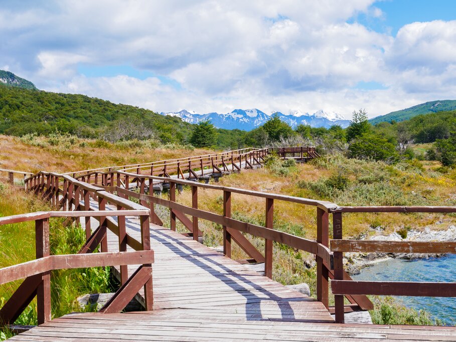 Vous serez transféré de votre hôtel à l’entrée du parc, où vous ferez une randonnée de 7 km sur un sentier côtier qui suit le canal Beagle. Profitez des vues sublimes sur le canal, appréciez la diversité de la flore et de la faune de la région, et passez devant les vestiges d’anciens établissements occupés autrefois par le peuple Yámana, un groupe indigène local. La randonnée se termine au centre d’accueil des visiteurs d’Alakush pour un délicieux déjeuner avec vue sur le Río Lapataia et le Lago Roca. Après le déjeuner, empruntez le sentier La Lenga pour atteindre le point le plus méridional de la route panaméricaine avant de retourner à Ushuaia.