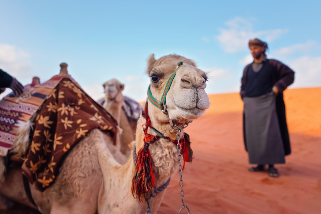 Jour 13 : Transfert vers le Wadi Rum, cuisine dans un camp bédouin, promenade à dos de chameau au coucher du soleil