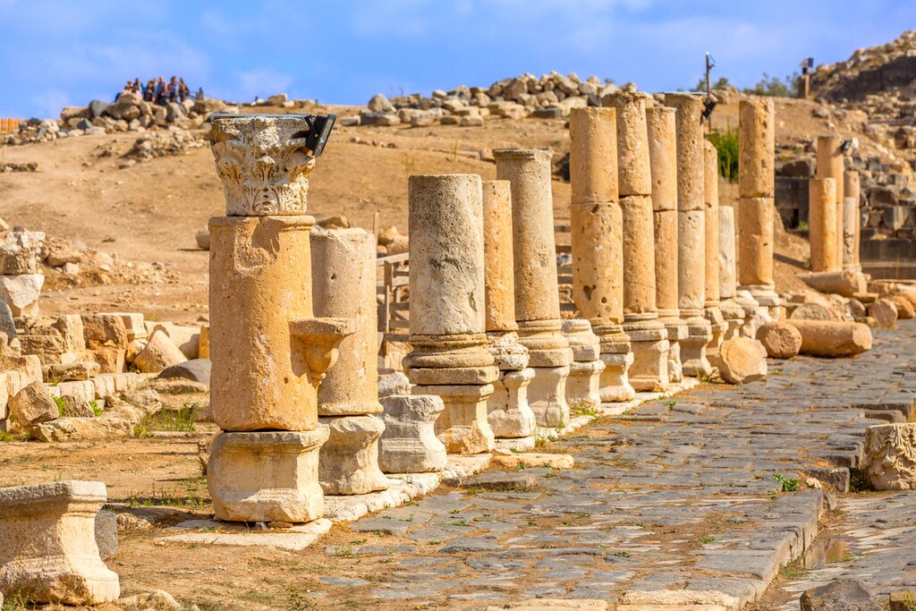 Promenez-vous dans les rues à colonnades ornées de mosaïques pour voir les vestiges des murs de la ville, des temples, des théâtres et des églises des époques grecque, romaine et byzantine. De retour en voiture, votre dernier arrêt est Umm Qais, une charmante ville qui surplombe la vallée du Jourdain et la mer de Galilée. Après une heure de route, vous rencontrerez votre guide pour une visite des ruines de Gadara, une ville antique fondée pendant la période hellénistique. Vous découvrirez la riche histoire de la ville en suivant votre guide dans les rues bordées de colonnades et en observant les vestiges de théâtres, de bains et de maisons.