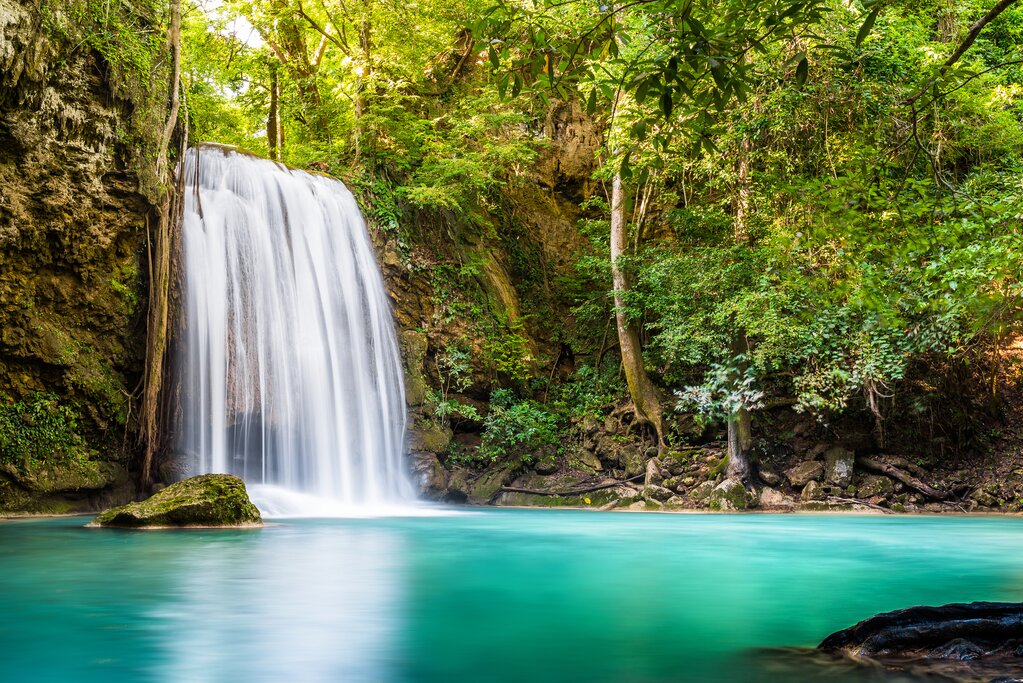 L’aventure commence dans le parc national d’Erawan, à l’ouest de la province de Kanchanaburi. Ce grand parc se compose principalement d’une forêt tropicale dense et vierge, couvrant 550 km². Le point fort du parc est la cascade d’Erawan, de couleur turquoise, composée de sept cascades distinctes qui s’élèvent en gradins au-dessus du sol de la jungle. Grimpez entre chaque palier et baignez-vous dans les magnifiques bassins clairs qui se trouvent au pied des chutes.