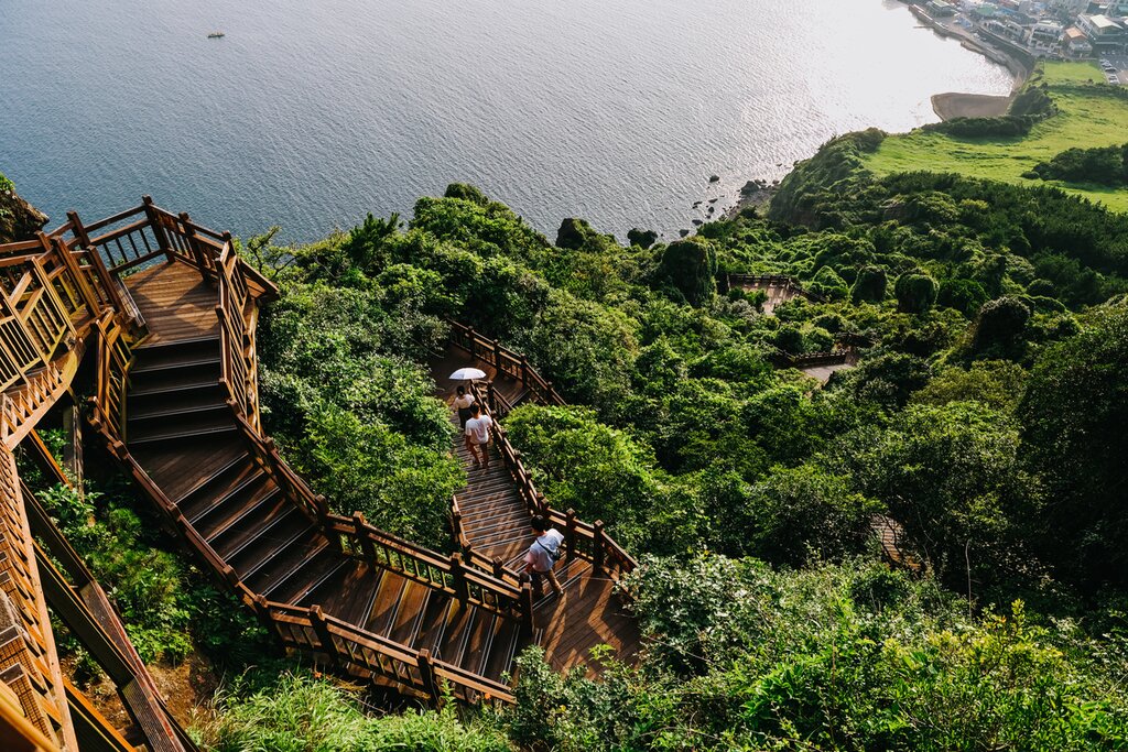 Ensuite, rendez-vous à la falaise de Jusangjeoli, sur la côte sud de l’île, pour voir l’endroit où la lave de Hallasan est entrée en éruption dans la mer de Jungmun. Dans l’après-midi, promenez-vous dans une forêt tranquille jusqu’à la cascade de Cheonjiyeon, haute de 22 mètres. Le nom se traduit par « le ciel relié à la terre ». Terminez la journée au musée des algues pour découvrir l’histoire des algues coréennes et déguster des algues grillées localement. Une autre activité intéressante consiste à observer les haenyeo (plongeuses) de l’île, qui gagnent leur vie en plongeant en apnée et en récoltant des algues et des mollusques, comme les oursins, dans l’océan.