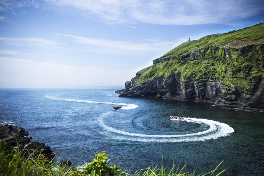 Commencez votre journée par un trajet en bateau d’environ 15 minutes jusqu’à l’île d’Udo (appelée « île aux vaches » en raison de sa forme), située au large de la côte nord-est de Jeju. Là, louez un vélo ou un scooter pour explorer les plages et les grottes marines de l’île. Goûtez aux spécialités locales telles que le haemul ttukbaegi (ragoût de fruits de mer), la glace à la cacahuète, le jus de hallabong et la bouillie d’ormeaux.
