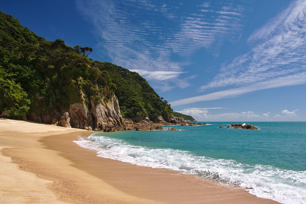 Ensuite, vous ferez les trois heures de route jusqu’au parc national d’Abel Tasman. Vous passerez le mont Cullen sur la route de Havelock, traverserez la charmante ville de Nelson et entrerez enfin dans le plus petit parc national de Nouvelle-Zélande. Nommé en l’honneur de l’explorateur néerlandais Abel Janszoon Tasman, premier Européen à avoir vu la Nouvelle-Zélande en 1642, le parc couvre une superficie de 91 miles carrés (237 km²) et vous pouvez l’explorer en bateau, en bateau-taxi ou à pied. La réserve marine possède des eaux cristallines et est célèbre pour ses plages de sable doré, ses falaises de granit sculptées et ses randonnées côtières.