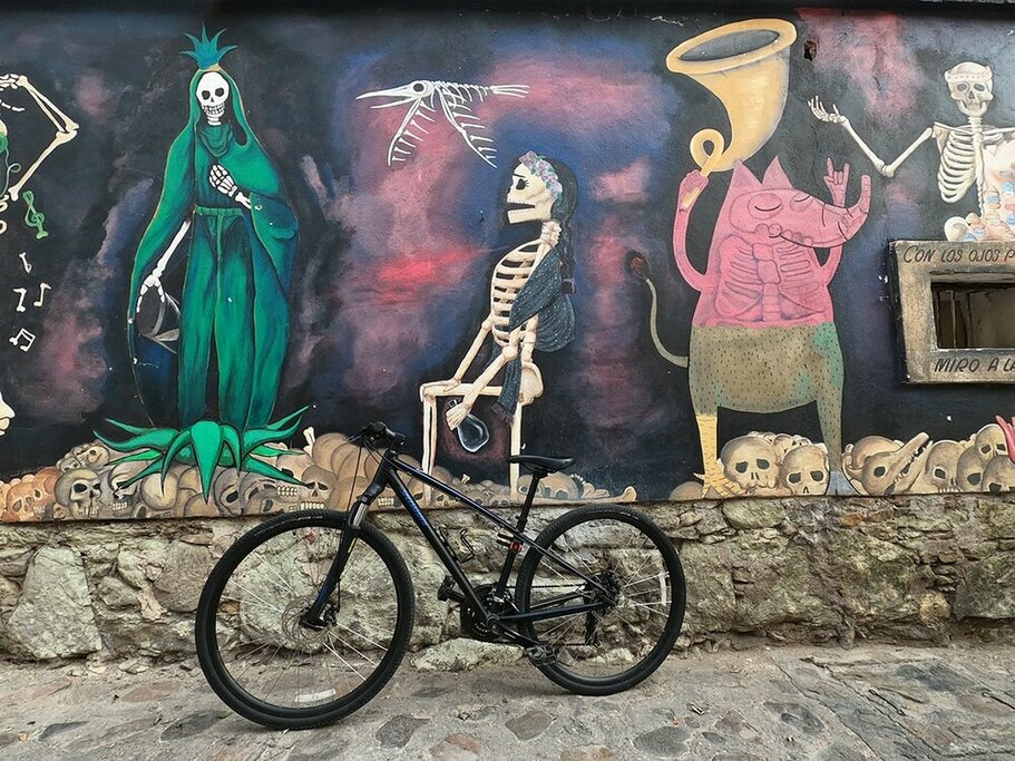 L’une des meilleures façons d’explorer Oaxaca est de le faire à deux roues. Ce matin, vous passerez quatre heures à pédaler sur 4,83 km (5 km) à travers trois quartiers animés. Les rues sont comme un musée en plein air, mettant en valeur la diversité et le talent des artistes de la ville. Vous admirerez l’art de rue coloré, des grandes peintures murales aux pochoirs et aux affiches, et vous vous arrêterez dans des lieux intéressants tels que des galeries d’art et des ateliers de graphisme. Vous aurez également le temps de déguster une boisson locale et une collation en cours de route.