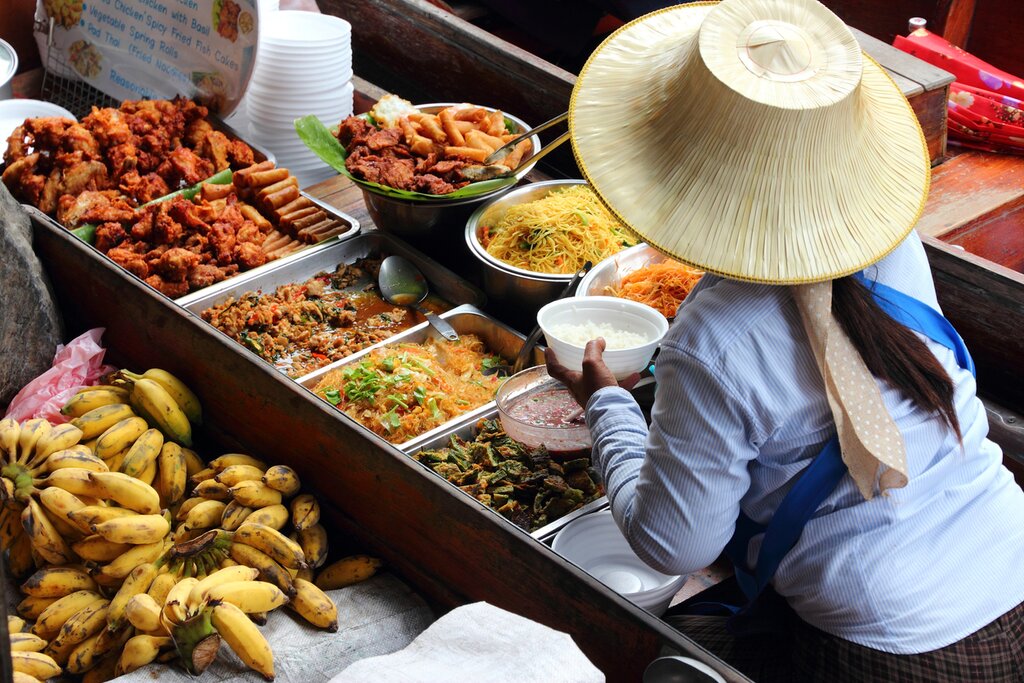 Dirigez-vous ensuite vers le marché flottant de Damnoen Saduak, où vous pourrez observer une pléthore de vendeurs colportant sur de petits bateaux en bois ornés de fruits colorés, d’en-cas et de souvenirs. Longez les canaux étroits et prenez des clichés de la vie thaïlandaise authentique ou montez à bord d’un bateau pour découvrir les marchandises de plus près. De nombreux marchands cuisinent et vendent également de la nourriture depuis leur bateau, comme les nouilles tom yum, une soupe de fruits de mer épicée à base de nouilles et de crevettes. Prenez le temps d’explorer le marché et de découvrir la culture locale avant de retourner à votre hôtel à Bangkok.