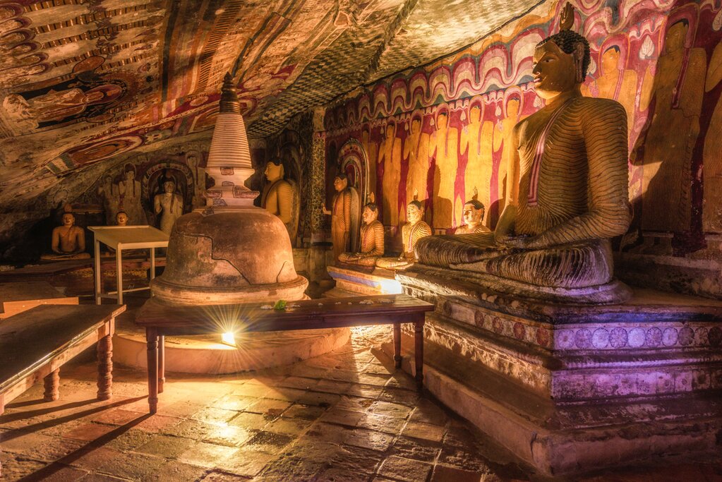 Bienvenue au Sri Lanka ! Votre vol arrive dans la ville de Colombo, où vous serez accueilli par votre chauffeur, qui vous conduira jusqu’à la ville de Sigiriya. Le trajet dure environ 3,5 heures et, en chemin, vous ferez votre première excursion sri-lankaise en visitant le temple de la grotte de Dambulla. Ce site classé au patrimoine mondial de l’UNESCO, également connu sous le nom de Temple d’Or de Dambulla, est un lieu d’une grande importance culturelle dont l’histoire remonte au deuxième siècle avant notre ère.