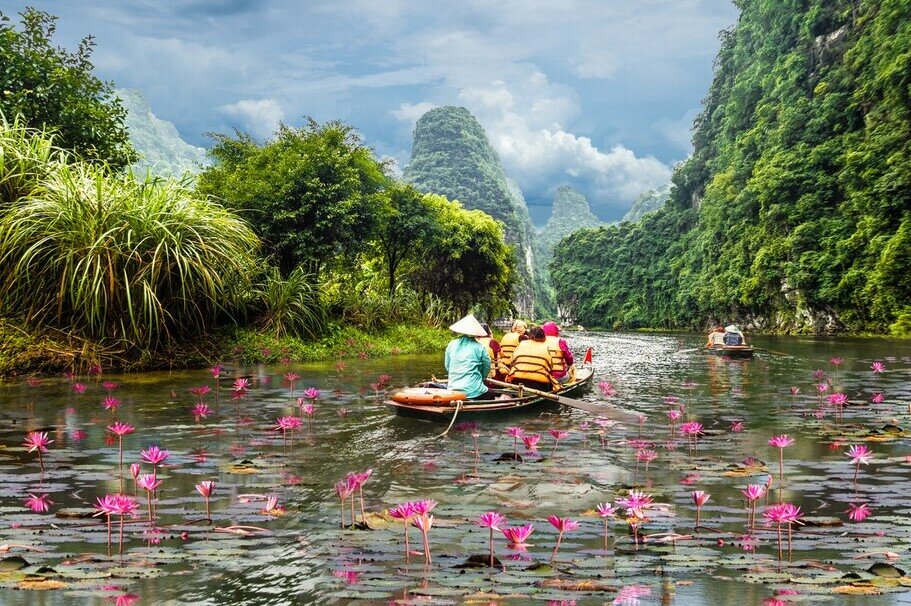 Le matin, rendez-vous avec votre chauffeur pour un transfert de deux heures au sud de Hanoi vers le delta du fleuve Rouge et la province de Ninh Binh. Cette zone rurale est l’une des régions les plus pittoresques du pays, connue pour ses rivières tranquilles serpentant à travers de vastes rizières vertes parsemées d’imposantes montagnes karstiques. Il s’agit d’une route panoramique au cours de laquelle vous passerez devant des collines verdoyantes et de vastes étendues de rizières verdoyantes.