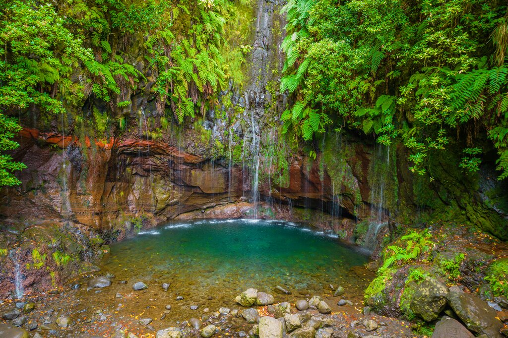 Commencez à 1 000 m au-dessus du niveau de la mer à Paúl da Serra, puis descendez par la vallée de Rabaçal, où vous suivrez une levada jaillissante jusqu’à la cascade de Risco. Faites une pause pour admirer l’eau, qui dégringole de 100 mètres jusqu’au rocher en contrebas, avant de continuer jusqu’à la cascade de 25 Fontes, où l’eau de source se jette dans un lagon féerique entouré de fougères géantes.