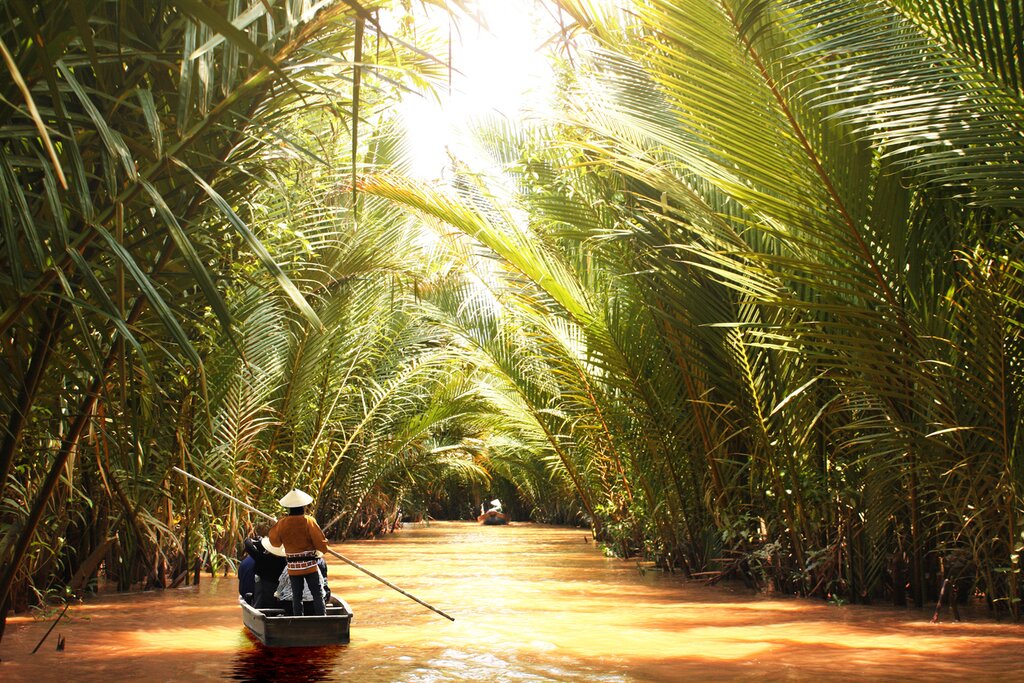 Aujourd’hui, vous troquerez la vie citadine pour les rizières et les fermes luxuriantes. Le matin, vous quittez Ho Chi Minh-Ville pour un transfert privé d’une heure et demie vers la ville fluviale de Ben Tre, située dans la célèbre région du delta du Mékong. Là, sautez dans un bateau à moteur et visitez le marché flottant de Cai Be, où les bateaux sont empilés avec des produits frais et d’autres aliments. Vous embarquerez ensuite sur un bateau à aubes pour vous enfoncer plus profondément dans le Mékong, le long de canaux plus petits, jusqu’à l’île d’An Bình. Vous continuerez jusqu’à Ut Trinh, une auberge traditionnelle où vous dégusterez un délicieux déjeuner fait maison.