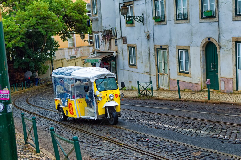 Aujourd’hui, vous vous amuserez à explorer les collines de Lisbonne et à découvrir les quartiers animés de la ville à bord d’un tuk-tuk électrique, un véhicule à trois roues. Rejoignez votre guide et commencez par le centre de Baixa, connu pour ses places élégantes et son architecture néoclassique. Vous vous faufilerez dans les rues charmantes et le long de la Praça do Comércio, une grande place face au fleuve, avant de remonter vers le quartier bohème de Bairro Alto. Suivez les rues pavées étroites pour admirer les bâtiments ornés d’azulejos, des carreaux décorés de façon complexe représentant des événements historiques, des scènes religieuses ou des motifs détaillés.