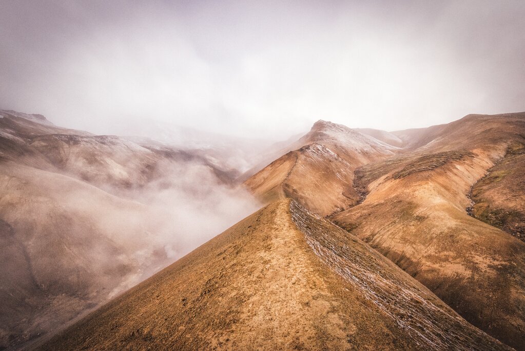 Le road trip continue aujourd’hui avec une demi-journée de route épique dans les hauts plateaux islandais. Votre première destination est le massif du Kerlingarfjöll, la montagne vedette des hautes terres du pays. La région qui l’entoure regorge de sources d’eau chaude, de mares de boue et de geysers naturels, ce qui en fait un paradis pour les randonneurs.