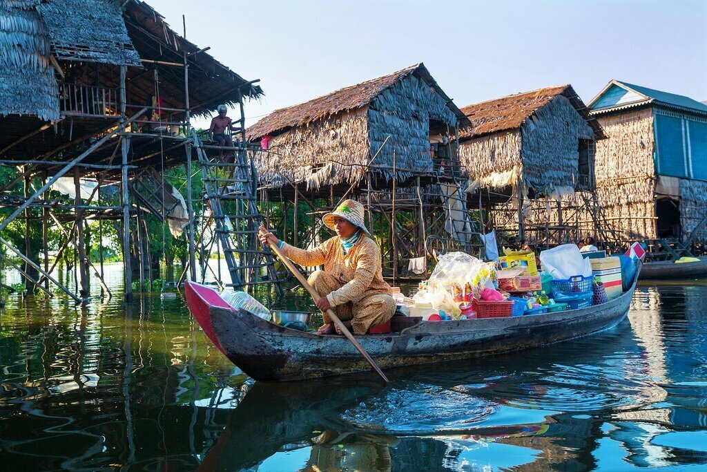 Ce matin, transfert d’environ 17,7 km (18 km) vers le sud jusqu’au Tonlé Sap. Il s’agit du plus grand lac d’eau douce d’Asie du Sud-Est et de l’un des écosystèmes les plus riches en biodiversité au monde. Ici, vous monterez à bord d’un bateau privé et siroterez une boisson rafraîchissante pendant que vous naviguerez vers les célèbres villages flottants du Tonlé Sap. Ces communautés remarquables disposent de leur propre infrastructure, y compris des écoles, des marchés et des restaurants.
