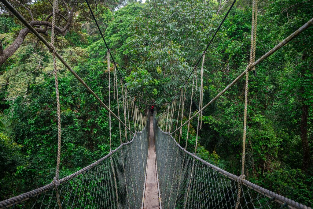 À votre arrivée, empruntez l’Inkaterra Canopy Walkway, un réseau de sept ponts suspendus qui relient huit plates-formes d’observation, en grimpant la première tour à 29 m au-dessus du sol de la forêt. Tout en marchant, gardez un œil sur les singes, les oiseaux de proie et les paresseux à trois orteils. Après avoir conquis la passerelle, descendez et continuez jusqu’à l’Anaconda Walk, une promenade de 200 mètres de long construite sur les zones humides saisonnièrement inondées des aguajales (marécages). Puis, à la tombée de la nuit, vous explorerez la forêt tropicale à pied à la recherche d’autres créatures nocturnes avant de retourner au lodge pour le dîner vers 19h30.
