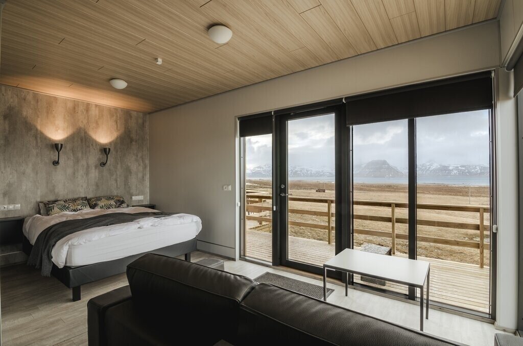 Il existe deux types de chambres, doubles et triples, et des options accessibles sont disponibles pour les personnes à mobilité réduite. Toutes les chambres offrent une vue panoramique sur la montagne Elliðatindar, et leur style contemporain, avec des tons terreux et du linge islandais local, crée un espace accueillant qui s’intègre au paysage environnant. Pour beaucoup, le point fort de l’hôtel est son restaurant de cuisine islandaise et son café, très appréciés des habitants et des clients de l’hôtel. Le directeur, Þór, vit sur la péninsule depuis 15 ans et son amour de la région et de l’hôtel se manifeste par la cuisson quotidienne de pains et de gâteaux frais.