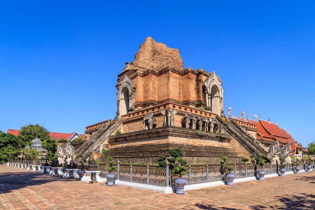 Continuez jusqu’au Wat Chedi Luang, l’un des temples les plus impressionnants de la ville, construit dans le style typique du Lanna avec un stupa imposant. Ici, vous pouvez faire des offrandes aux moines et recevoir leurs bénédictions. Faites une pause pour déguster un bol crémeux de khao soy, un célèbre plat du nord de la Thaïlande composé de nouilles croustillantes, de crème de noix de coco et d’un soupçon d’épices.