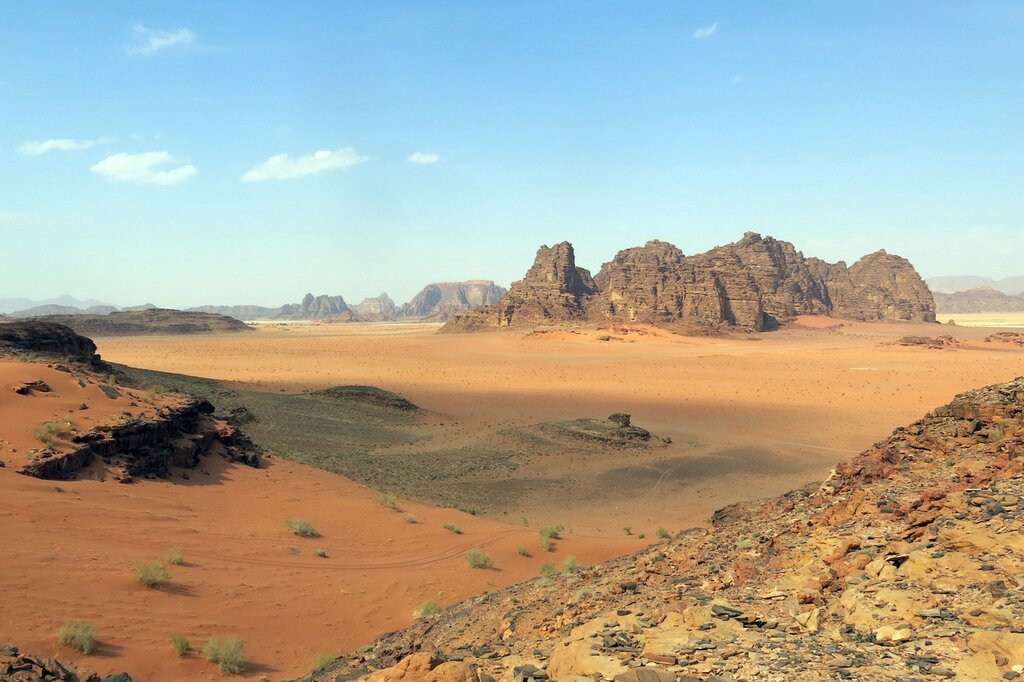 Jour 8 Vol pour Amman (Jordanie) via Le Caire, transfert à Wadi Rum, excursion dans le désert en 4×4 Wadi Rum