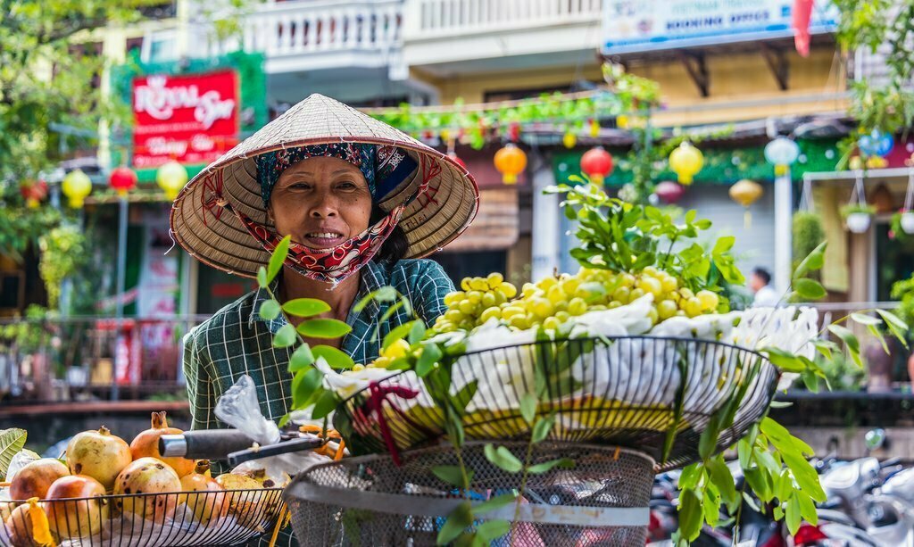 Plongez dans la cuisine vietnamienne rustique lors d’une visite du marché combinée à un atelier de cuisine. L’aventure d’aujourd’hui vous ramènera à la campagne, mais pas avant d’avoir visité un marché local pour y trouver les ingrédients frais nécessaires. Ensuite, avec un panier à vélo bien rempli, vous quitterez Hoi An et pédalerez le long d’une route secondaire au bord de la rivière, en passant par des élevages de crevettes, des villages de pêcheurs et Cam Thanh. Ce village au bord de l’eau est célèbre pour ses mangroves luxuriantes et ses forêts de cocotiers de 84 hectares – n’oubliez donc pas votre appareil photo.