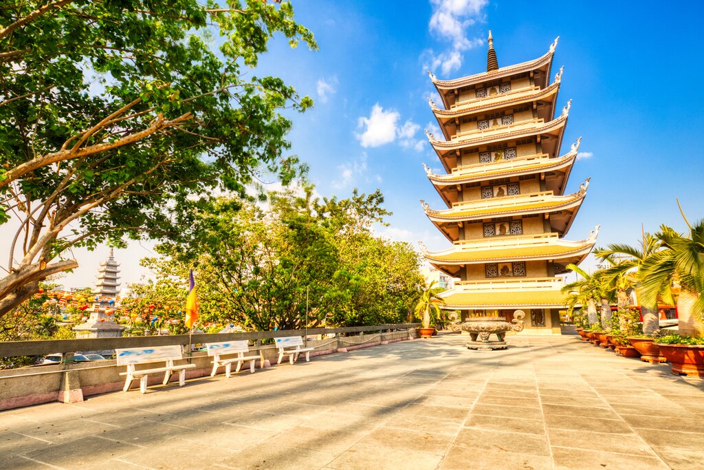 Plus tard, vous vous rendrez au nord-est de la ville et à Cho Lon (quartier chinois). Vous vous arrêterez à Thien Hau, un temple du XVIIIe siècle dédié à la déesse chinoise de la mer Mazu. La dernière étape de la journée est Vinh Nghiem. Ce temple bouddhiste emblématique date du début du XXe siècle et est connu pour son architecture distincte qui mêle modernité et éléments des temples vietnamiens traditionnels. La pagode abrite notamment une tour de sept étages ornée de délicates sculptures. Après avoir visité la pagode et la tour, vous retournerez à votre hôtel.