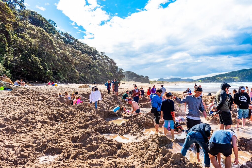 Sur le chemin de la péninsule, faites un détour par les gorges de Karangahake. Site de la première ruée vers l’or en 1875, cette ville est imprégnée de l’histoire des mines d’or, et vous pouvez emprunter des sentiers dans les spectaculaires gorges de Waitawheta. Ensuite, aventurez-vous sur la Hot Water Beach, au nom créatif, où de l’eau chauffée par géothermie s’infiltre dans le sable. À marée basse, creusez un trou et créez votre propre piscine minérale dans le sable fin et doré.