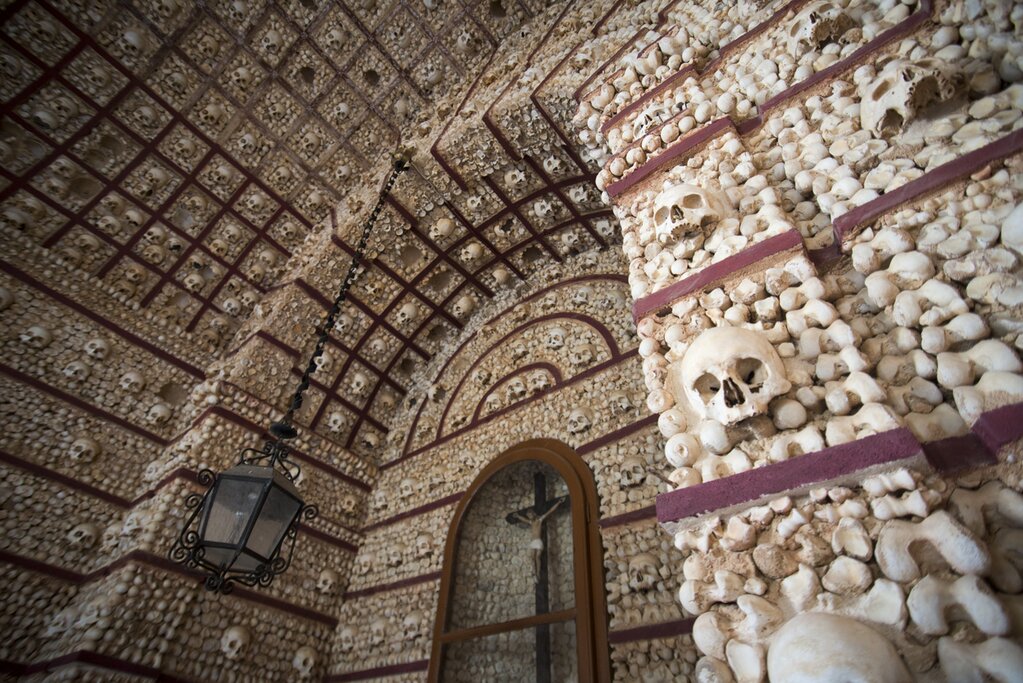 Ce matin, plongez dans l’histoire et la culture de l’Algarve en visitant la ville d’Almancil. Prenez le train à une heure et demie vers l’est et visitez l’Igreja de São Lourenço. Cette église baroque du XVIIIe siècle est ornée d’azulejos (carreaux traditionnels portugais) peints à la main. À l’intérieur, vous découvrirez l’étrange Capela dos Ossos, une chapelle ornée d’ossements humains et de crânes disposés selon des motifs décoratifs.