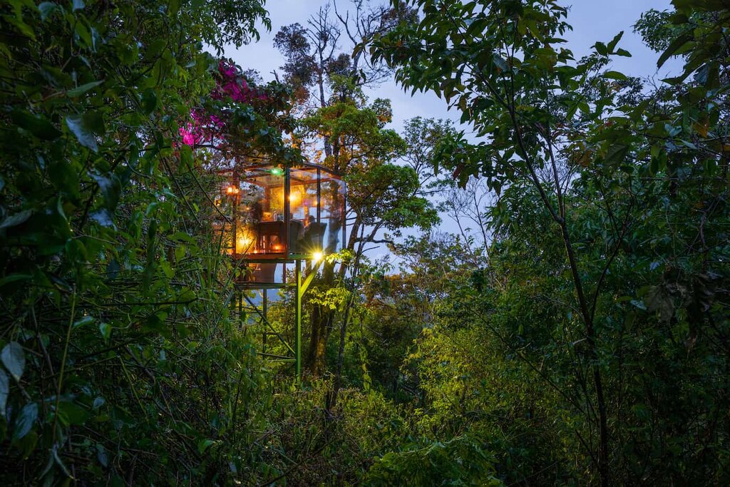 Suivez votre guide le long de sentiers sinueux et apprenez à connaître les différents types de flore et de faune et leur importance écologique. Arrêtez-vous pour admirer les grenouilles, les papillons et les oiseaux, ainsi que les variétés de mousse, les lianes qui serpentent et les arbres imposants. Ensuite, vous profiterez d’un dîner dans les arbres à l’hôtel de charme San Lucas. Vous dégusterez un dîner de dégustation à neuf plats dans une boîte en verre suspendue à 15 mètres de hauteur dans la forêt tropicale, offrant une vue spectaculaire sur la canopée.