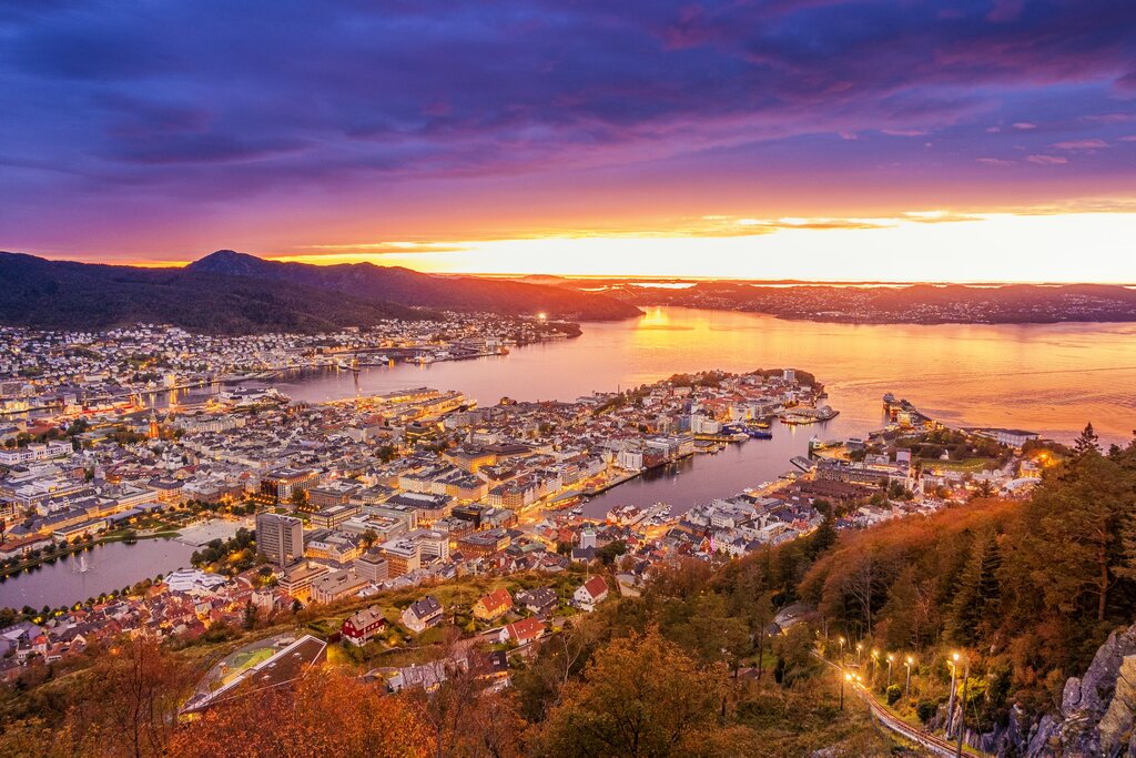 Après avoir pris possession de votre hôtel, vous pouvez vous aventurer dans une visite guidée rapide. Une activité incontournable est l’ascension de l’une des sept sœurs, sept montagnes proéminentes situées au nord-est de Bergen. Pour profiter des meilleures vues sur la ville, prenez le funiculaire de Fløibanen (ou marchez sur le sentier) jusqu’au sommet du mont Fløyen (1 050 pieds/ 320 m). Ensuite, vous pourrez vous promener tranquillement sur le sentier tout en découvrant des sculptures de trolls cachées le long du chemin. Vous pourrez ensuite visiter le quartier historique des quais de Bryggen (classé au patrimoine mondial de l’UNESCO) pour admirer des maisons en bois colorées datant des années 1700.