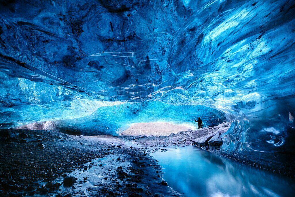 Aujourd’hui, vous vous immergerez (littéralement) dans les merveilles du géoparc de Katla, la première zone désignée de ce type en Islande et un site du patrimoine mondial de l’UNESCO. Le matin, vous vous rendrez en voiture au géoparc et au glacier Kötlujökull, une sortie du glacier Mýrdalsjökull. Là, vous rencontrerez un guide expert, recevrez votre équipement et passerez en revue les protocoles de sécurité. Puis, ensemble, vous entrerez dans la grotte et, pendant 2 à 3 heures, vous explorerez des parois scintillantes et de vastes gouffres de glace.
