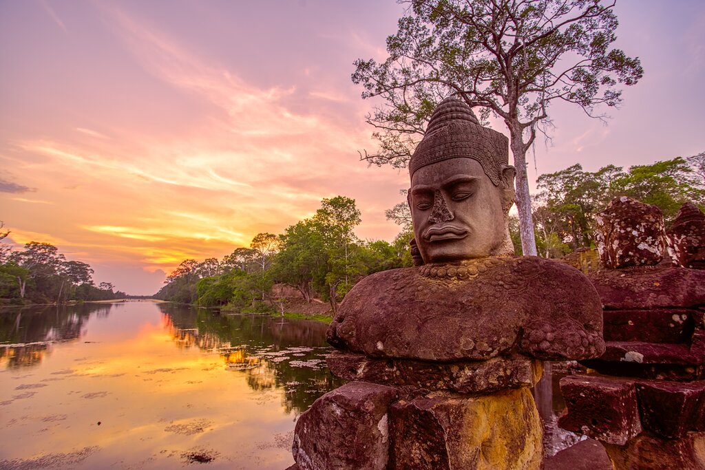 La visite se poursuit à Angkor Thom (littéralement « Grande Cité »), autrefois la cité royale la plus impressionnante de la période cambodgienne d’Angkor, et son imposant temple du Bayon. Composé de 54 tours gothiques, il a été commandé au XIIe siècle par Jayavarman VII, dont le visage souriant et les yeux brillants sont représentés dans les 216 sculptures de pierre. Parmi les autres structures que vous visiterez, citons la Terrasse des éléphants (avec des sculptures et des bas-reliefs d’éléphants), le Phimeanakas (une pyramide à trois niveaux) et la Terrasse du roi lépreux, connue pour ses sculptures de démons et de figures mythologiques.