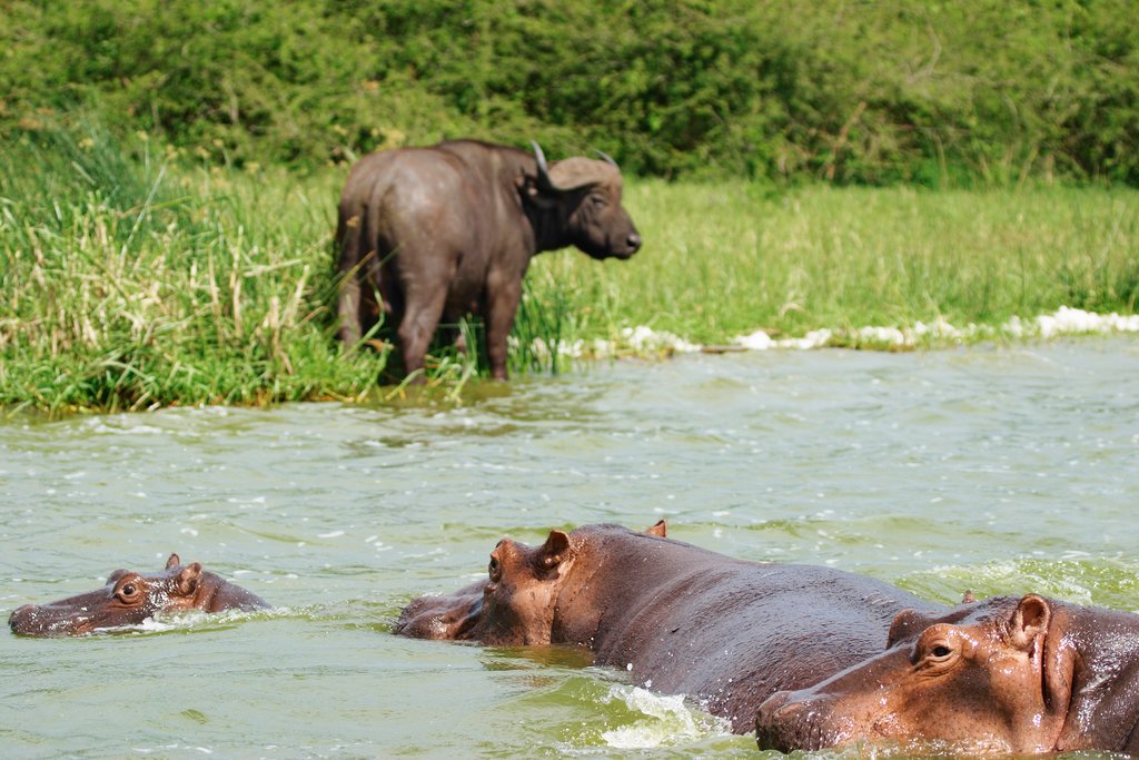 Après le déjeuner et un repos au bord de la piscine de votre lodge, partez sur l’eau pour un safari en bateau. En suivant le canal de Kazinga à Mweya, qui relie le lac Edward au lac George, vous pourrez observer des oiseaux (plus de 100 espèces vivent le long de ce canal) comme l’écumeur africain, le grand pélican blanc, la spatule et le guêpier. Les hippopotames se vautrent au bord de l’eau, les crocodiles du Nil se prélassent au soleil sur les rives et les éléphants viennent souvent s’abreuver dans l’eau.
