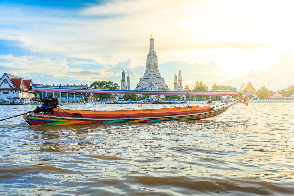 Après avoir fait le plein, vous embarquerez sur un bateau à longue queue pour découvrir les canaux de la ville. Glissez le long des voies d’eau, en passant devant des maisons en bois sur pilotis, des marchés flottants animés et une végétation riveraine luxuriante, qui contraste fortement avec la ligne d’horizon moderne de la ville. Observez les habitants pêcher, laver leur linge et se rencontrer le long des canaux. Gardez l’œil ouvert pour découvrir des sites tels que le marché flottant de Taling Chan et le Wat Arun, connu sous le nom de « Temple de l’Aube ». Après la visite en bateau, dînez dans l’un des restaurants le long de la rivière avant de retourner à votre hôtel.