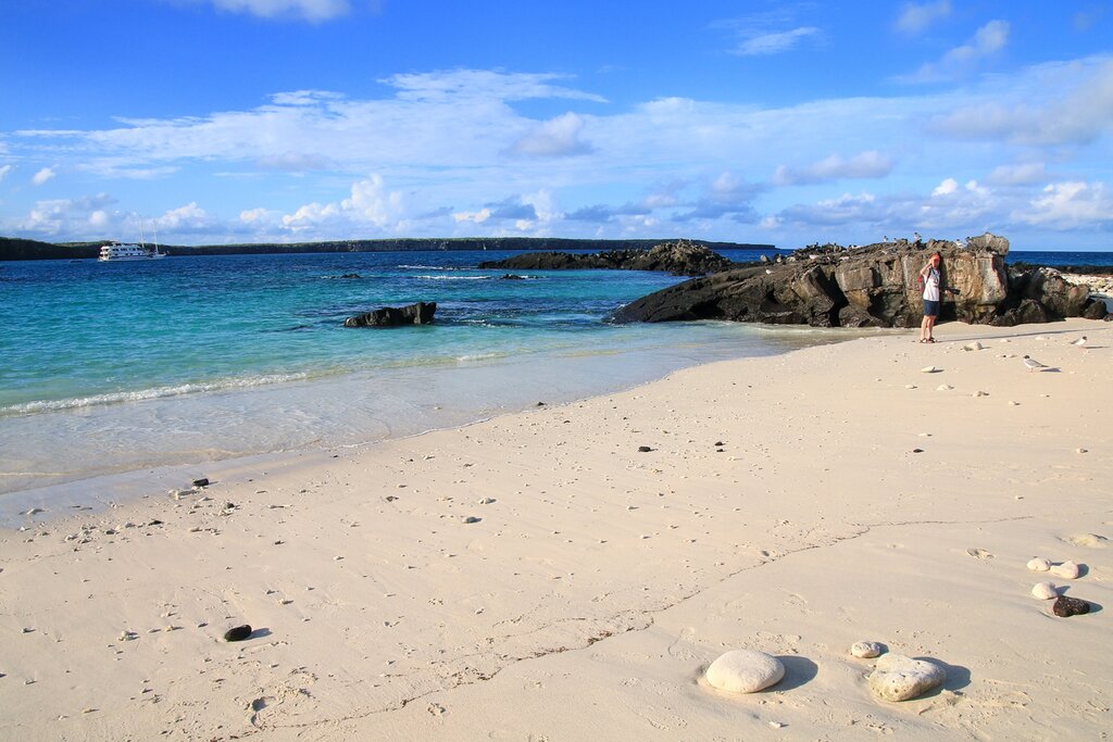 Dans l’après-midi, vous vous rendrez au Cerro Brujo (colline des sorcières), vestige d’un cône volcanique qui fut l’un des premiers sites visités par Charles Darwin lors de son premier voyage dans l’archipel. À proximité, vous trouverez une plage de sable corallien, l’endroit idéal pour se baigner et faire de la plongée avec masque et tuba. Gardez un œil sur les oiseaux côtiers et migrateurs pendant que vous nagez et vous détendez sur le sable fin – vous verrez probablement des pélicans, des fous à pieds bleus et des goélands à queue d’hirondelle qui nichent dans la région. Les lions de mer et les iguanes marins sont également fréquents le long de la plage.