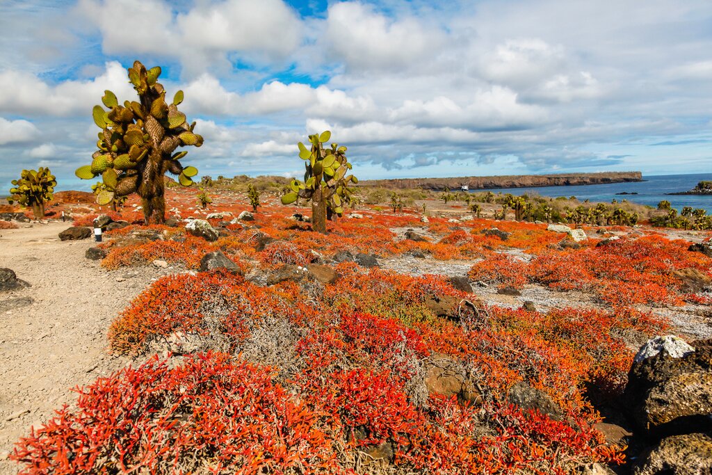 Derrière les salines et les arbustes épineux, un sentier mène à une zone de forêt tropicale sèche parsemée de palo santo, d’arbustes de cordia jaunes, de minuscules cactus à figues de Barbarie et de tapis qui prennent une couleur rouge vif pendant la saison sèche. Après une montée raide à travers un ravin jusqu’au sommet de la falaise, promenez-vous autour de la seule colonie d’oiseaux des Galápagos abritant les trois espèces de fous : à pieds bleus, à pieds rouges et de Nazca. Vous verrez également les deux espèces de frégates (la grande et la magnifique), célèbres pour leur poche à ballon écarlate.