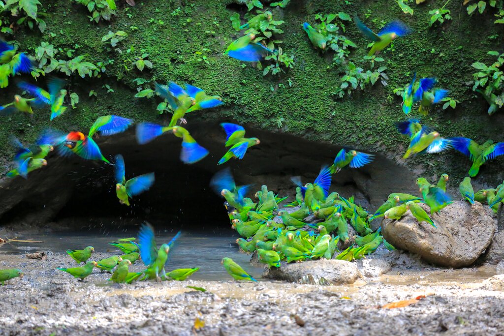 La journée commence par une randonnée de 30 minutes le long d’un sentier voisin pour atteindre l’un des points forts du parc national de Yasuní : les lécheurs d’argile à perroquets. Des centaines d’oiseaux affluent vers ces petites falaises sur les rives du Río Napo pour se nourrir du sol riche en minéraux, créant ainsi l’un des spectacles les plus captivants du monde de l’ornithologie. N’oubliez pas d’apporter vos jumelles pour observer les 11 espèces de perroquets et de perruches qui fréquentent le flanc de la falaise, et gardez un œil sur les autres animaux comme les singes hurleurs, les tapirs et les pécaris qui viennent s’y abreuver.