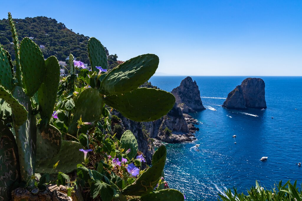 Promenez-vous sur la Piazza Vittoria et arrêtez-vous pour déguster une glace avant de prendre le télésiège qui relie Anacapri au mont Solaro. À 589 mètres au-dessus du niveau de la mer, c’est le point culminant de l’île et il offre une vue imprenable sur les baies et les montagnes de Calabre. Lorsque vous serez prêts, redescendez et déjeunez en admirant la côte. Après une promenade dans la chic vieille ville de Capri, ne manquez pas d’aller voir les jardins d’Auguste. Ces jardins méditerranéens bien entretenus offrent une vue mondialement connue sur les rochers Faraglioni, situés en contrebas.